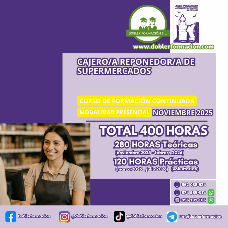 “CAJERO/A REPONEDOR/A DE SUPERMERCADOS.”. 400 HORAS (280 HORAS TEÓRICAS + 120 HORAS PRÁCTICAS) HORARIO: MIÉRCOLES DE 18.00 A 20.30 HORAS....