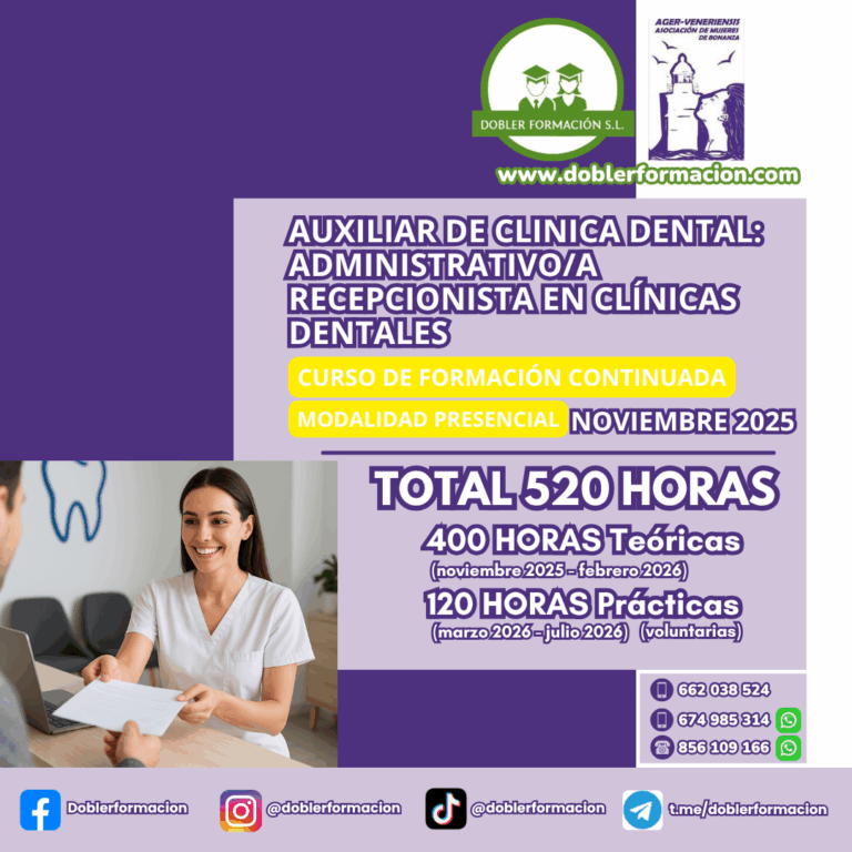 “AUXILIAR DE CLÍNICA DENTAL: ADMINISTRATIVO-RECEPCIONISTA EN CLÍNICAS DENTALES” 520 HORAS (400 HORAS TEÓRICAS + 120 HORAS PRÁCTICAS) HORARIO: MIÉRCOLES DE...
