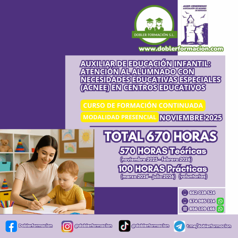 AUXILIAR DE EDUCACIÓN INFANTIL: ATENCIÓN AL ALUMNADO CON NECESIDADES EDUCATIVAS ESPECIALES (ACNEE) EN CENTROS EDUCATIVOS”. HORARIO: MARTES Y VIERNES DE...