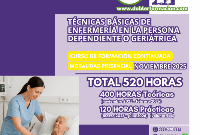 “TÉCNICAS BÁSICAS DE ENFERMERÍA EN LA PERSONA DEPENDIENTE O GERIÁTRICA”. HORARIO: MARTES Y VIERNES DE 09.30-11.30 HORAS. INICIO DEL CURSO MARTES 11 DE NOVIEMBRE DE 2025. 520 HORAS (400 HORAS...