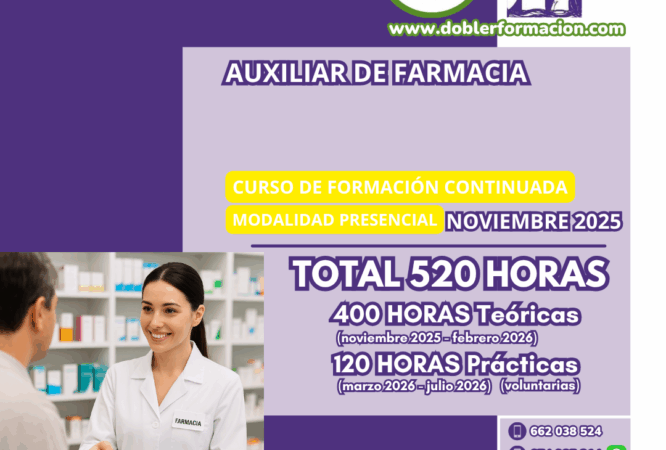 “AUXILIAR DE FARMACIA”. HORARIO: LUNES Y JUEVES DE 18.00 A 20.00 HORAS. INICIO DEL CURSO LUNES 10 DE NOVIEMBRE DE 2025. 520 HORAS (400 HORAS TEÓRICAS + 120 HORAS PRÁCTICAS...