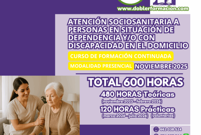 “ATENCIÓN SOCIOSANITARIA A PERSONAS EN SITUACIÓN DE DEPENDENCIA Y/O CON DISCAPACIDAD EN EL DOMICILIO”. HORARIO: LUNES Y JUEVES DE 16.00-18.00 HORAS. INICIO DEL CURSO LUNES 10 DE NOVIEMBRE DE 2025....