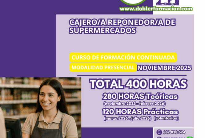 “CAJERO/A REPONEDOR/A DE SUPERMERCADOS.”. 400 HORAS (280 HORAS TEÓRICAS + 120 HORAS PRÁCTICAS) HORARIO: MIÉRCOLES DE 18.00 A 20.30 HORAS. FECHA DE INICIO DEL CURSO: MIÉRCOLES 13 DE NOVIEMBRE. ...