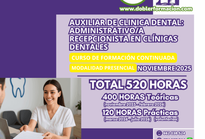 “AUXILIAR DE CLÍNICA DENTAL: ADMINISTRATIVO-RECEPCIONISTA EN CLÍNICAS DENTALES” 520 HORAS (400 HORAS TEÓRICAS + 120 HORAS PRÁCTICAS) HORARIO: MIÉRCOLES DE 16.00 A 18.00 HORAS. FECHA DE INICIO DEL CURSO: MIÉRCOLES...