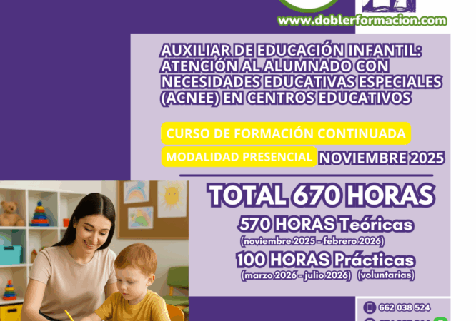 AUXILIAR DE EDUCACIÓN INFANTIL: ATENCIÓN AL ALUMNADO CON NECESIDADES EDUCATIVAS ESPECIALES (ACNEE) EN CENTROS EDUCATIVOS”. HORARIO: MARTES Y VIERNES DE 11.30 A 14.00 HORAS INICIO DEL CURSO MARTES 11 NOVIEMBRE...
